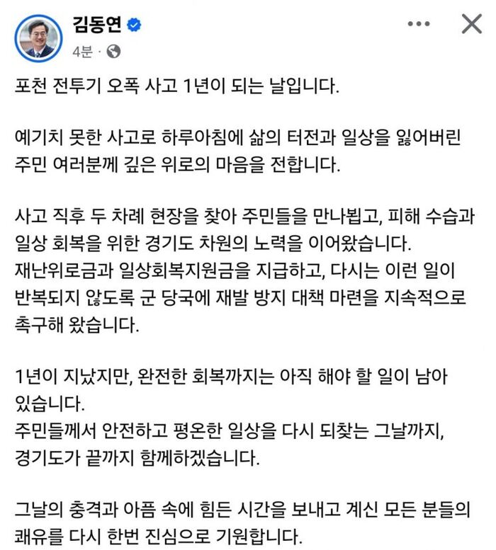 [신문고뉴스] 이재상 기자 = 김동연 경기도지사가 포천 전투기 오폭 사고 1주기를 맞아 피해 주민들에게 위로의 메시지를 전하며 완전한 일상 회복을 위한 지원 의지를 밝혔다.